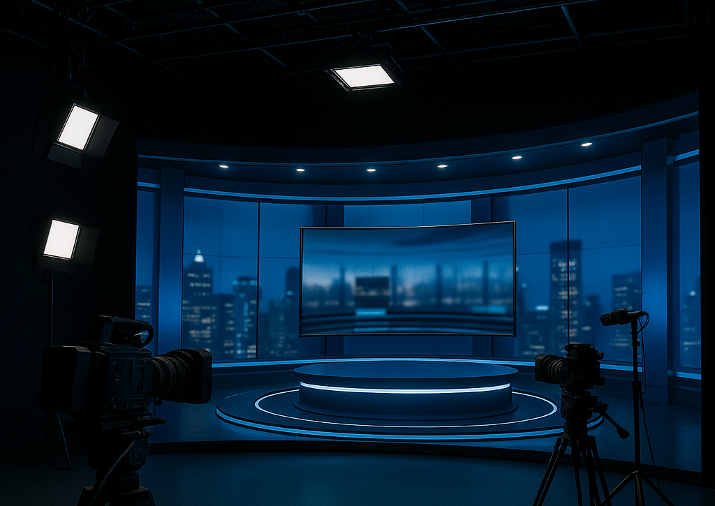 Turnkey podcast + interview setups with lighting, and a polished broadcast look.
